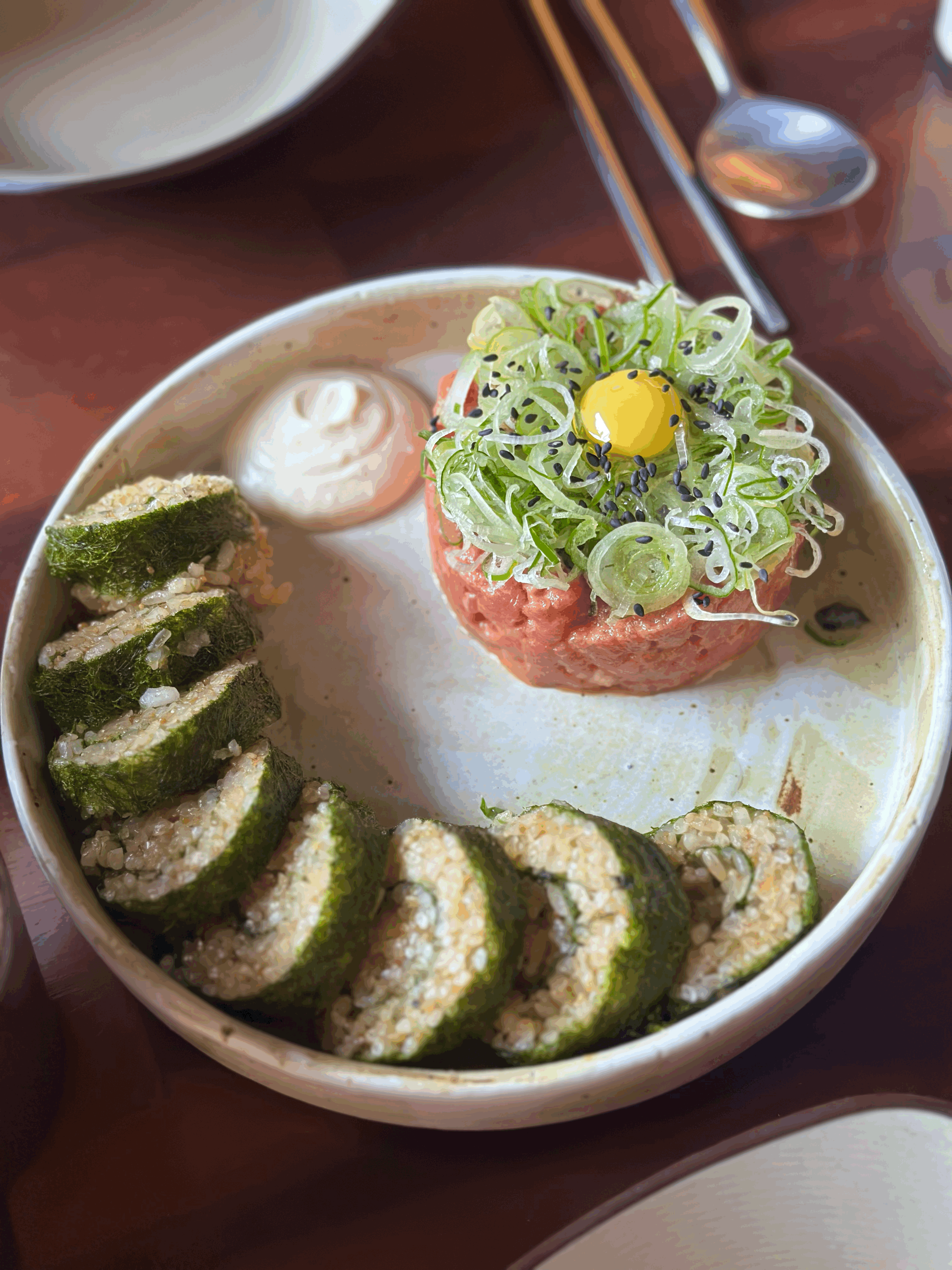 육회 단독으로도 맛있지만, 모든 소스를 감태 롤에 올리고 육회까지 올려서 드셔보시는 걸 추천드려요!